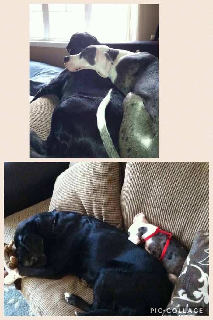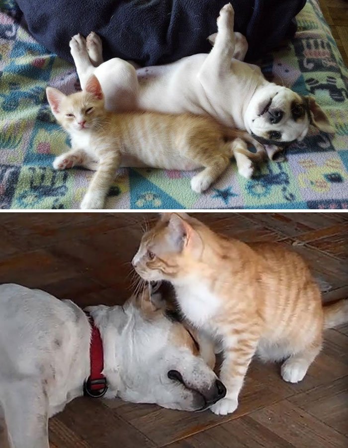 Before and after pics of animals growing up together.