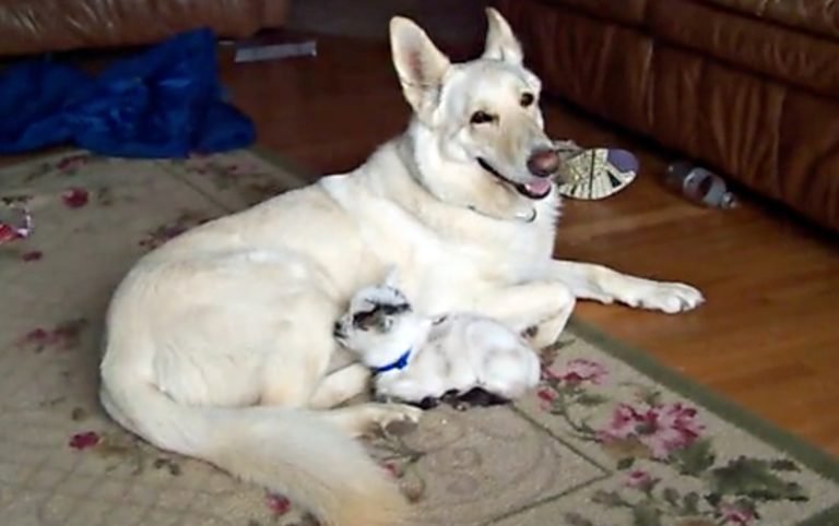 Shadow, a White German Shepherd, met the family’s new addition, a newborn baby goat and fell head over paws! Shadow immediately took to the goat as if he were one of her own. The cuddling and kisses that ensued are absolutely precious! Thankfully, the family got it all on video for our enjoyment.
