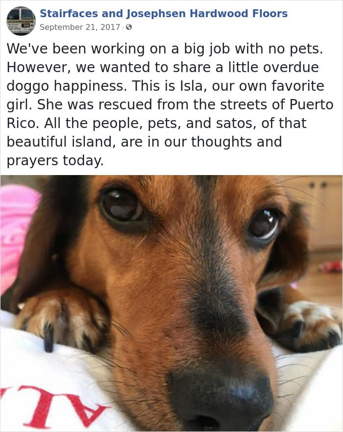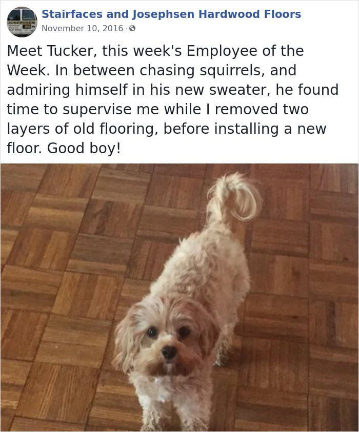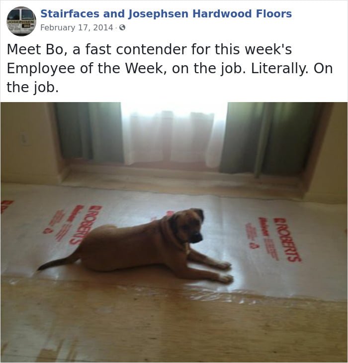 He owns a three generation business. Josephsen Hardwood Floor Company carries out various works such as repairing floors, or installing wooden floors and stairs. During his work he often encounters the unhappy looks of the dogs that live there. While their looks seek to say a lot, Fred takes the opportunity to take their epic photos. They are posted on his social networks, as Employee Of The Week’ Award, thus showing that humor is present in his company.