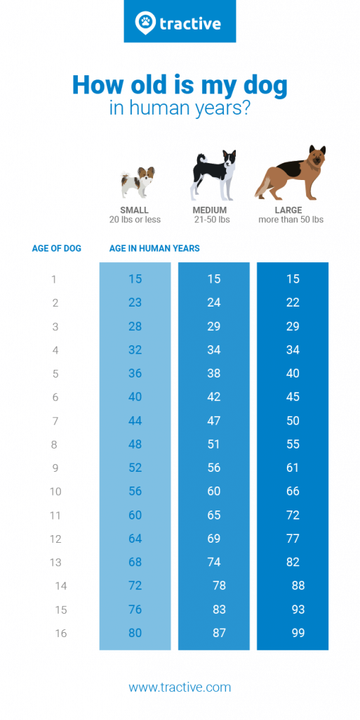 After this age added to the age of 4 years for one human year on the dog’s age (Example: A 4-year-old dog would be equal to a man aged 24 years)
