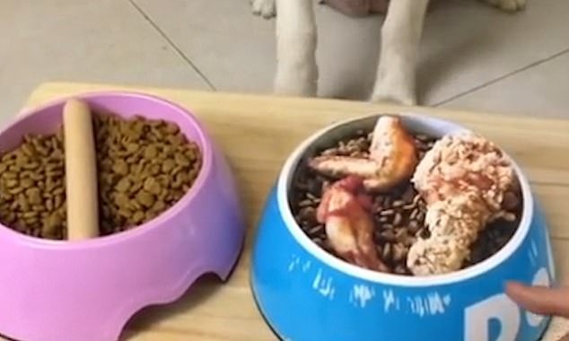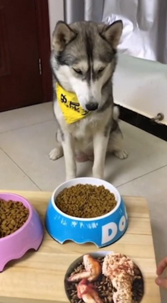 A canine placed in challenge by its owner, had to make a choice. The husky is offered two bowls, one with normal dog food and another with tasty chicken on top. Having a choice, the puppy chose without hesitation the most delicious dish eagerly awaiting its consumption.