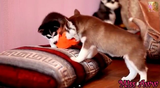Husky Puppies Fighting Over Toy