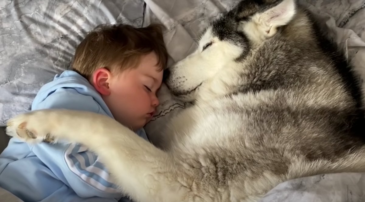 A little boy named Parker walks into his bedroom to find the Husky in his bed. And this is one comfy husky who has no intentions of moving anytime soon! No matter how much Parker or Dad may try, this dog isn’t budging.