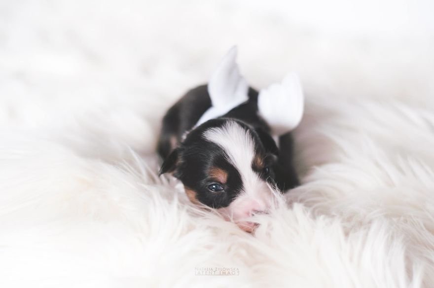Puppies have the same effect on us as newborn babies. They are beautiful, adorable and the most pure creature on earth. A photographer had the idea to capture new born puppies with little angel wings on their backs. For the photoshoot she selected border collie new born puppies and the results are divine.