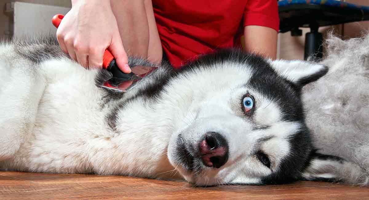 In double coated dogs there is a over coat made of thicker protecting hairs, and an under coat made of dense and soft hair. This type of coat is found in breeds such as Siberia Huskies, Alaskan Malamutes, Samoyeds and many others. Having a double coated dog means that they should be groomed by brushing throughout the year but most often done in spring when is the major shedding period of the year. When the weather becomes more and more warm the dense undercoat starts to do a complete shed. When you look at a dog in shed, they have “tufts” of fur that is soft and dense peaking through the longer guard hairs of the topcoat, this is called molting.