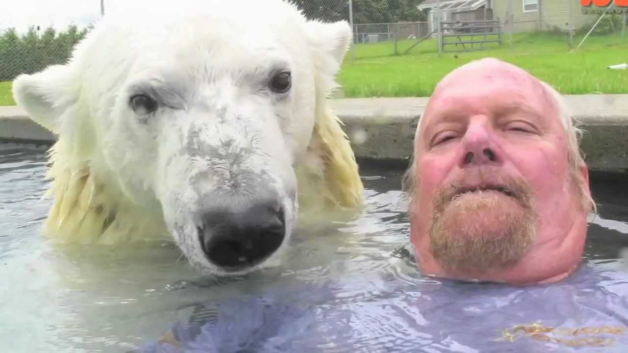Agee is a 60-stone (800lb) polar bear that they’ve managed to train to star in high-budget TV adverts and movies. She’s also often seen messing about with Mark, giving him bear hugs, accepting loving kisses and even swimming with him.