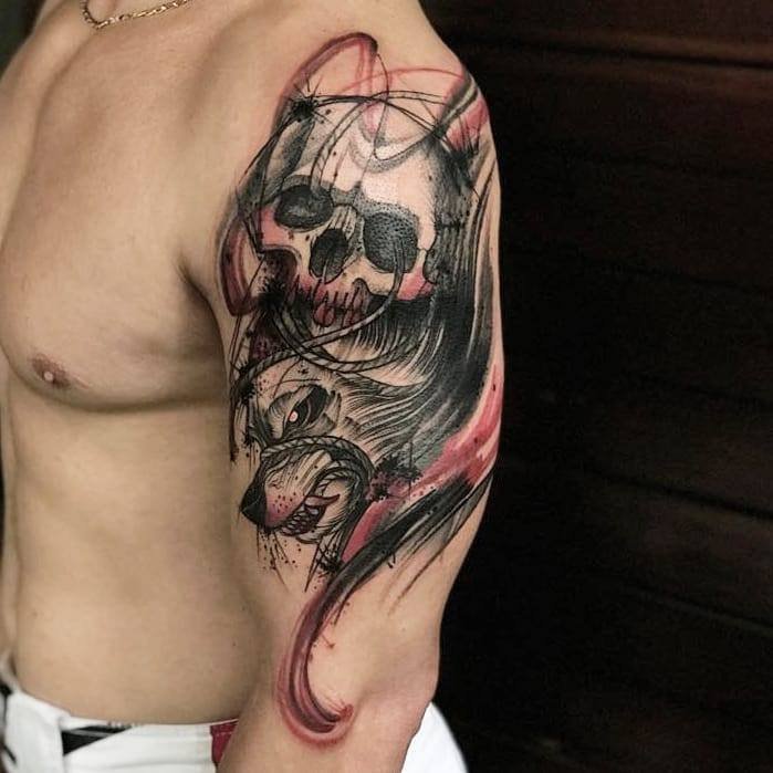 8. A black wolf tattoo done in front of the body, belly. The wolf’s mouth is bleeding and looks like he has just defeated an enemy.